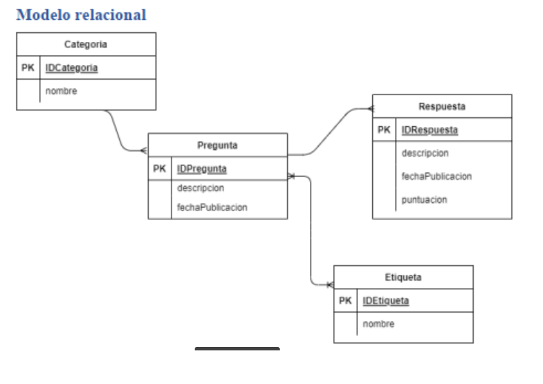 estoy tratando de descifrar como armar esta base datos, tengo la siguiente informació pero tengo dudas de donde colocar las claves foraneas ya que el esquema no está tan claro, agradeceria si me pudiesen dar una mano. Sobre todo en la relacion "one or many to one or many" con pregunta y etiqueta, un saludo.
