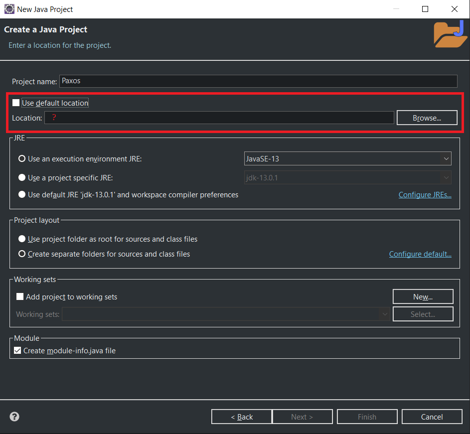 - Uncheck "Use Default Location" and enter the path to this directory