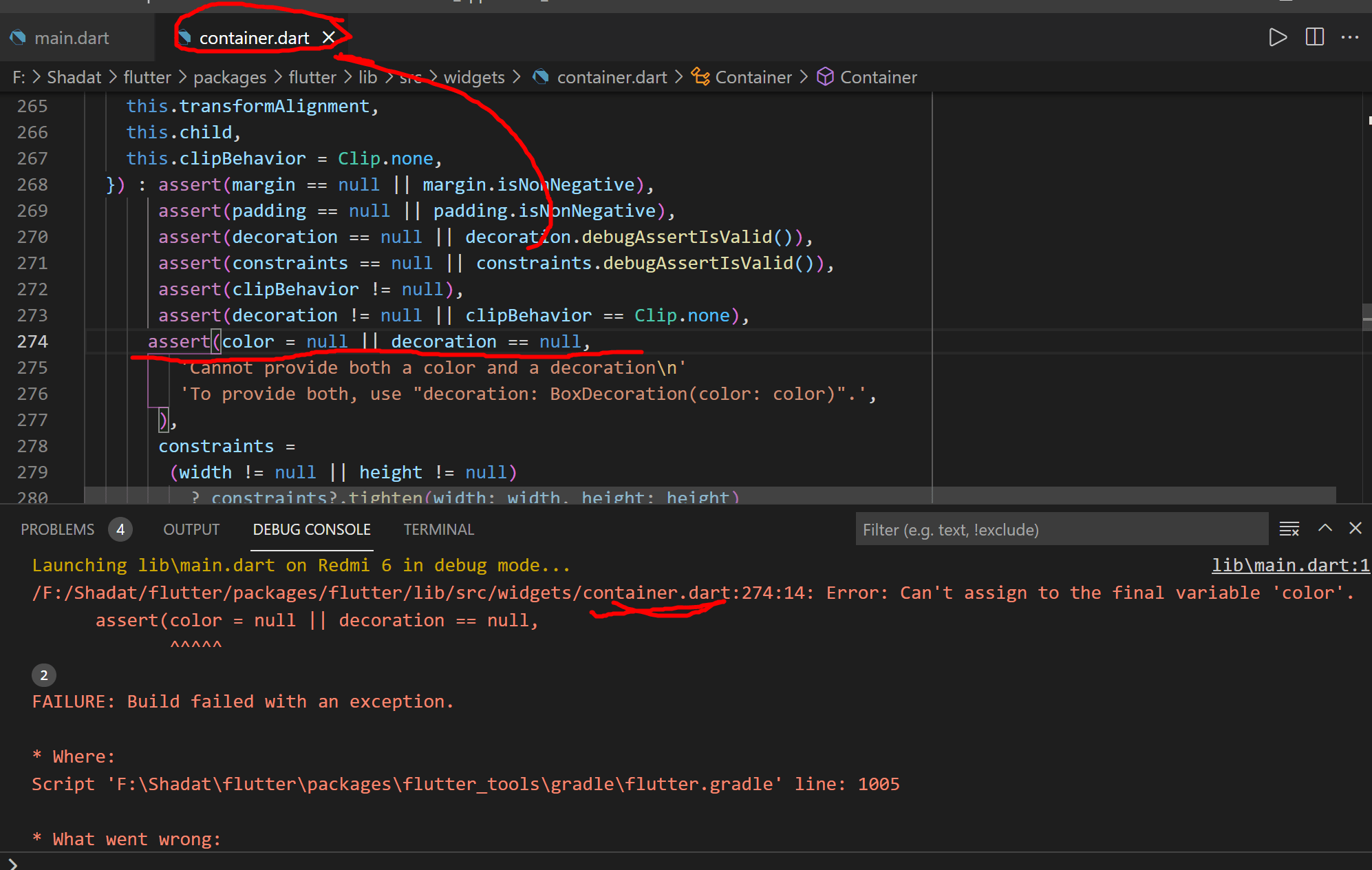 Somehow you’ve corrupted your Flutter install. That line 274 is meant to say color == null not color = null