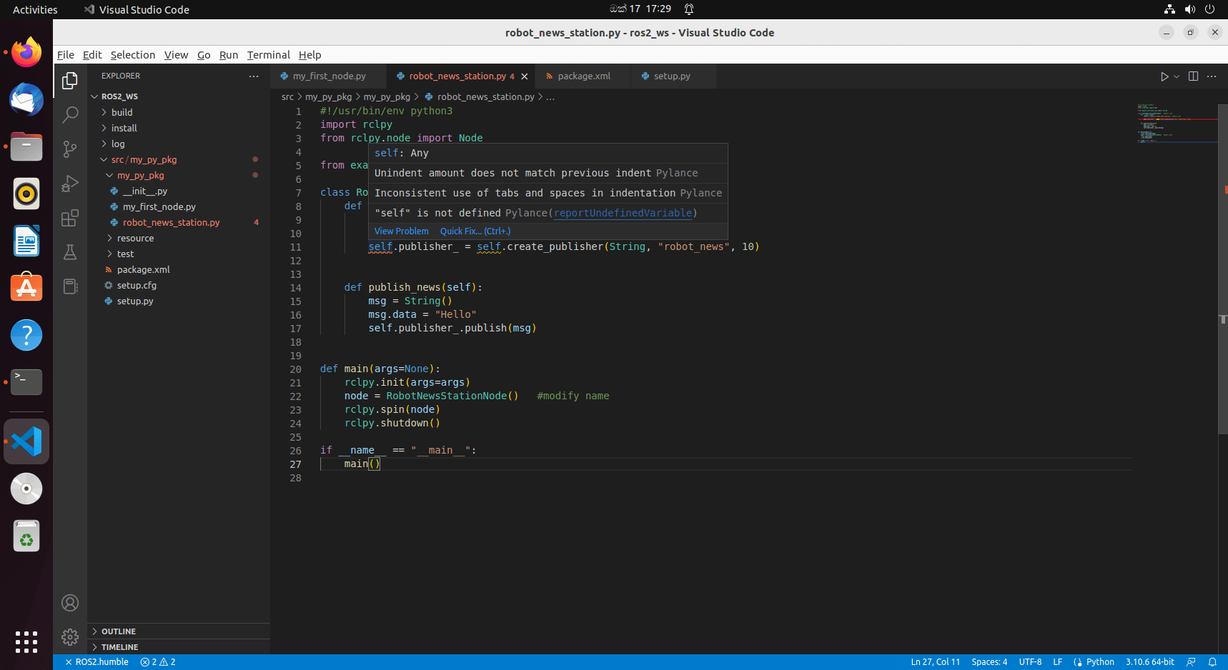 I’m following a tutorial on understanding writing python publisher in ROS2. This is an example that I’m creating. The code does not seem to have any errors but in vscode, the self word is underlined in red and when I hover the mouse it shows that "self" is not defined. How can I resolve this issue in vscode?