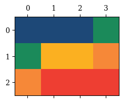 plt.matshow(np.arange(12).reshape(3, 4), cmap=ListedColormap(colors))