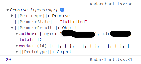The return value of GetGithubData is Promise, so I’m wondering if that’s the reason why the update doesn’t run simply because I can’t access the object inside. However, if that is the case, in order to resolve Promise, I have to add "await", and in order to do so, I have to change to the function to "async" function, and when I change it to the async function, I get an error if the "return" returns an object, and the radar chart is not displayed in the first place.