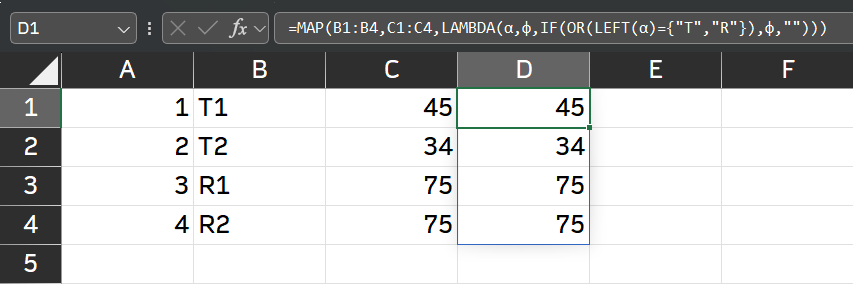 =MAP(B1:B4,C1:C4,LAMBDA(α,φ,IF(OR(LEFT(α)={"T","R"}),φ,"")))