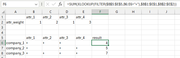 =SUM(XLOOKUP(FILTER($B$5:$E$5,B6:E6="+"),$B$1:$E$1,$B$2:$E$2))