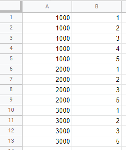 So the answer that I’m looking for is 2000 and 3000 because they do not have "4" in their respective sets in column B.