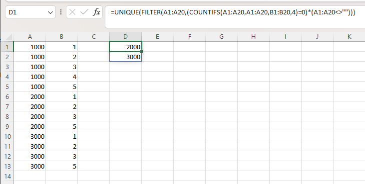=UNIQUE(FILTER(A1:A20,(COUNTIFS(A1:A20,A1:A20,B1:B20,4)=0)*(A1:A20<>"")))