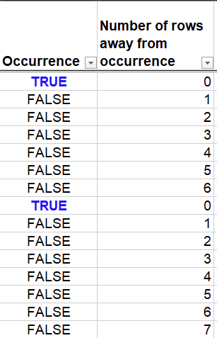 The cells in the column Number of rows away from occurrence counts the number of rows that are away from a TRUE event in Occurrence column.