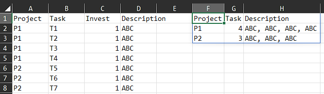 I have a data structure in excel where I want to generate a aggregated table based on a more detailed table based on some clustering e.g. Tasks -> Projects -> Investmentcluster.