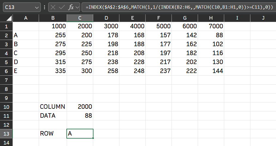 =INDEX(A2:A6,MATCH(C11,INDEX(B2:H6,match(C10,B1:H1,0),),-1))