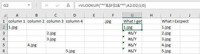 =BYROW(A2:D6,LAMBDA(x,XLOOKUP("*"&F1,x,x,,2)))
