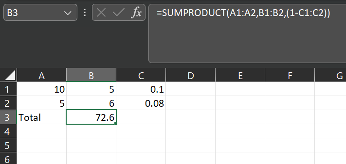 =SUMPRODUCT(A1:A2,B1:B2)*1-C1:C4