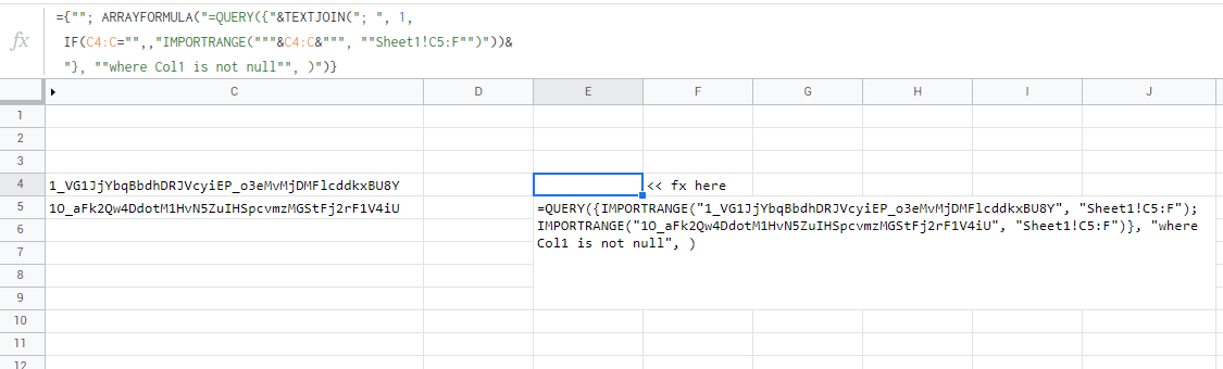 I’ve tried variations of CONCATENATE, JOIN, etc to combine C into one cell that is referenced in the QUERY OR IMPORTRANGE, but no luck so far.