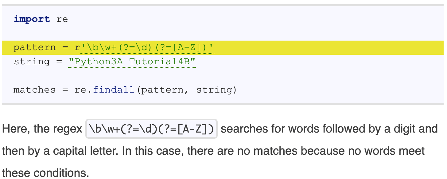 It says r'\b\w+(?=\d)(?=[A-Z])' search for words followed by a digit and then by a capital letter. Python3A consists of a word Python followed by a digit 3 and a capital letter A. If the statement is correct, then it should match Python.