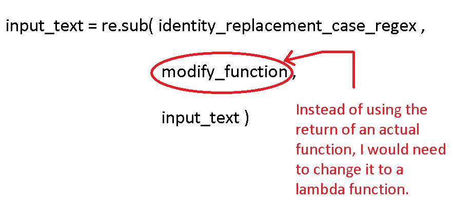 in this case, the function called modify_function, would require that within the same line input_text = re.sub(identity_replacement_case_regex, modify_function, input_text) the result from a lambda function can be passed as a replacement argument.