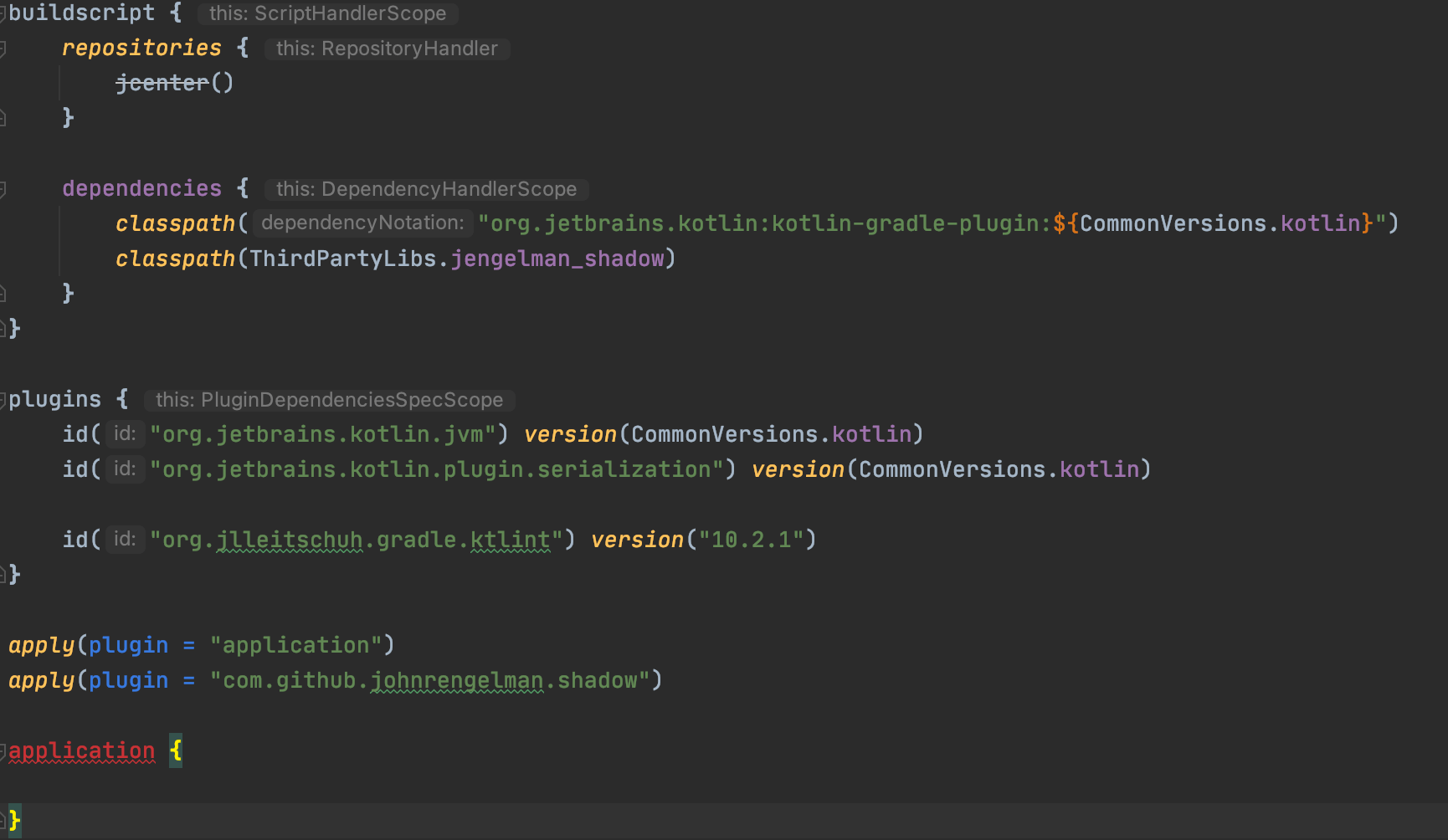 I have a Kotlin application with kotlin-dsl gradle files. I’d like to set mainClassName to be able to use com.github.johnrengelman.shadow.