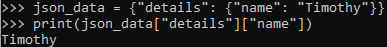Assuming the details key is also a string, the correct way to print the value of name from the key "details" is: print(json_data["details"]["name"]