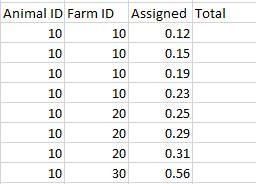 Ex. if the "Animal ID" = 10 and "Farm ID" = 10, I need to find its max value (0.23 in this case) and its min value (0.12 in this case) and subtract the two. Then, I want to do the same for when "Animal ID" = 10 and "Farm ID" = 20 and so on. I tried the following, however, I get the following error: KeyError: 'Assigned'. I’m not sure where I’m going wrong. Also, if there’s a better way to achieve this than the method I’m using, I’d really appreciate learning about that.