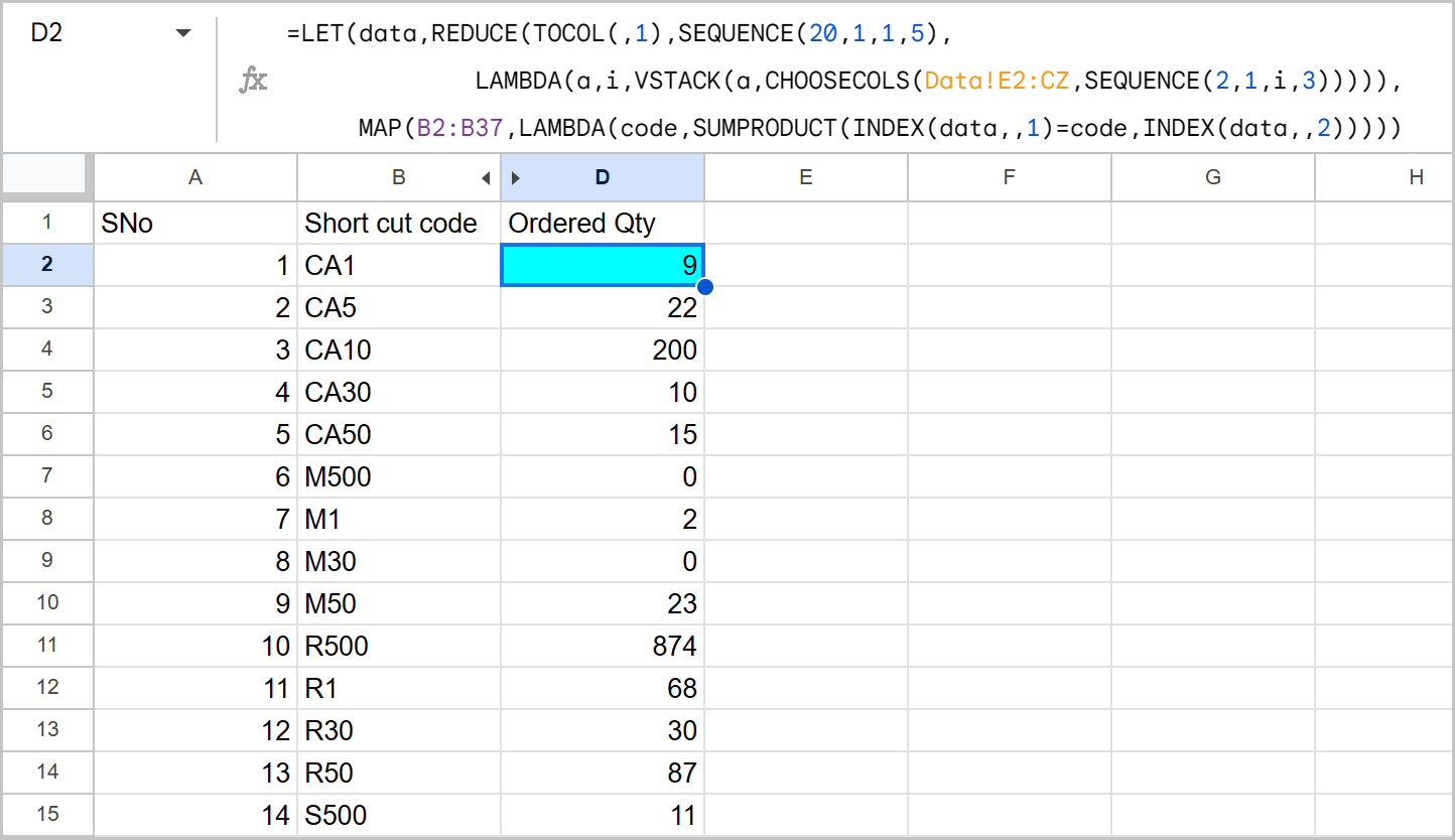 MAP(B2:B37,LAMBDA(code,SUMPRODUCT(INDEX(data,,1)=code,INDEX(data,,2)))))