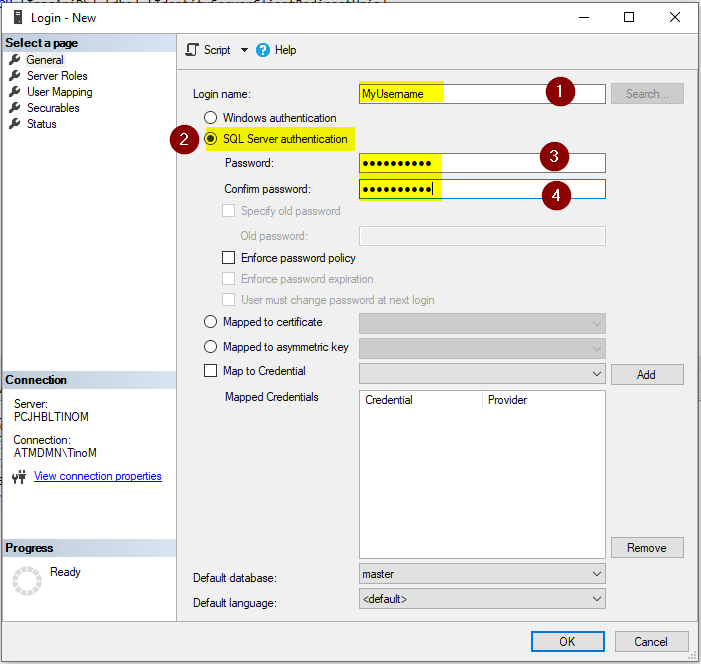 If you’re using SQL Server Management Studio, use the following options to create the username and password: