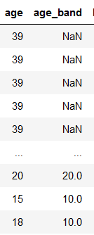 what i want to do is suppose for ‘age’ columns value between 30-39,i want to fill the missing value of age_band = 30. Like that suppose for ‘age’ columns value between 80-89,i want to fill the missing value of age_band = 80. How can i do this in pandas dataframe?