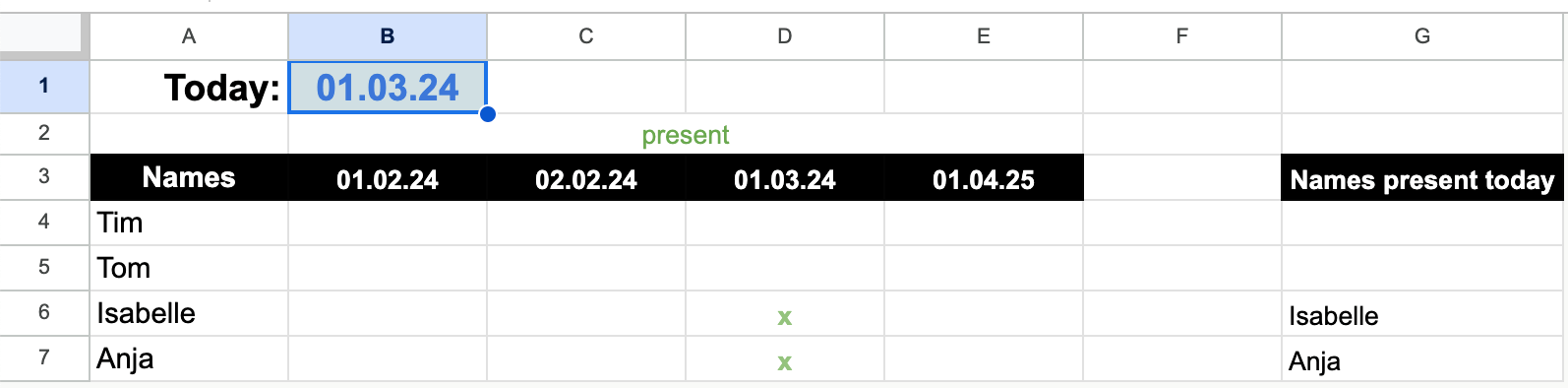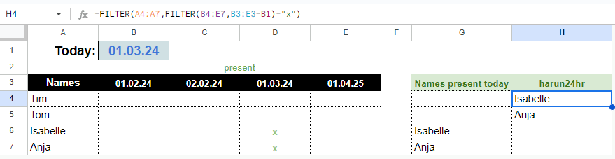 Now I want to filter the person that are present at a given date. I cannot figure out which function I have to use. I was very succesful wirh the function FILTER. But I cannot figure out how to apply the filter range according the current date.