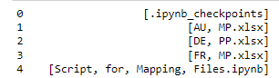 Basically, it reads the filenames and store them in a dataframe (df_file). Then, I try to filter by ".xlsx" and store this on a list of lists (t1_list).