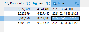 For every position ID, there are 2 rows, 1 for opening the order and 1 for closing the order. The goal here is to get the larger date ( i.e. the closing date ).