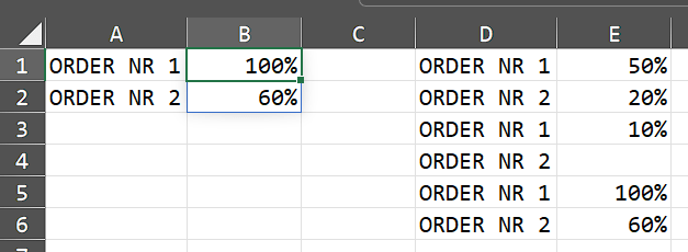 Now, I am looking for a formula which gives me the latest percentage/ percentage most bottom for the corresponding order number. E.g., for order number 1 in column G on sheet 1 100% should be returned and for order number 2 60% should be returned.