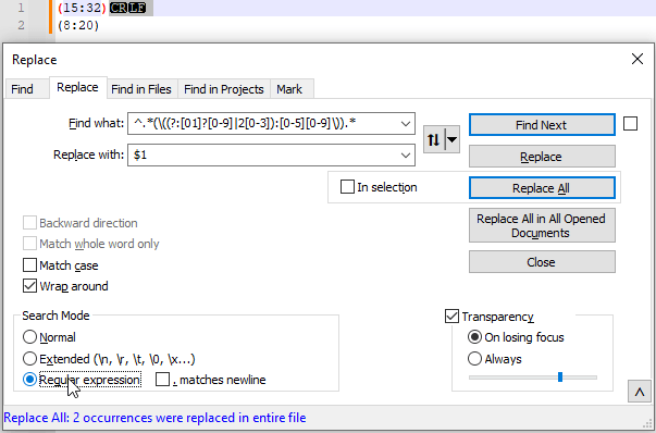 Find What: ^.*(\((?:[01]?[0-9]|2[0-3]):[0-5][0-9]\)).*
