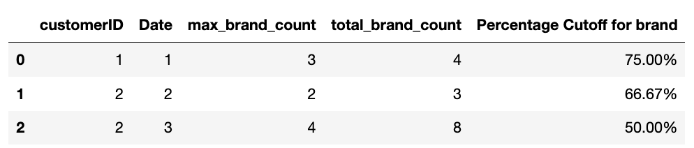 | customerID | Date | Brand | Brand Count | Percentage Cutoff for brand |