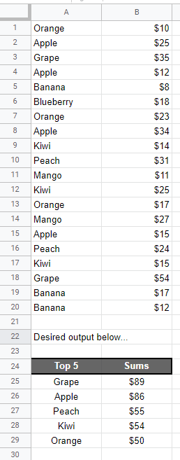 I am looking to find the combined sum of each value in Column A and display the top 5 results.
