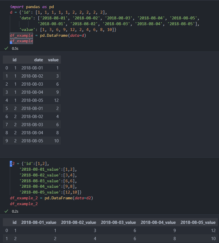 I only have one row for every id. A desirable output would be like the following code. Note that new columns names are made of the value from date, concatenated with the ‘value’ column name.