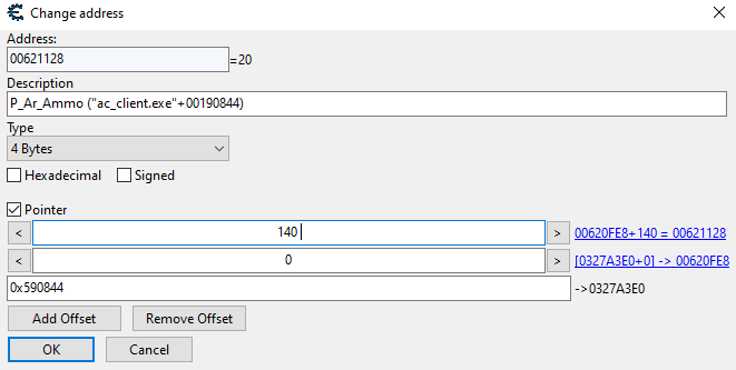 I first managed to determine that ac_client.exe starts at 0x400000 so adding that with the offset of 0x00190844 gives me 0x590844 which is the main static address. Then in that picture above you can see that 0x590844 just points to 0x0327A3E0. Then we can see that we are adding an offset of 0 then seeing where that points to which seems to be 0x00620FE8. Now here is where I am lost how does adding 0x00620FE8 with 140 aka 0x8C ever equal 0x00621128? Because I am getting 0x621074 from my calculations. I am trying to figure out how to get to 0x00621128 when starting at 0x590844 so I can replicate it inside of my C project by using ReadProcessesMemory but I cant seem to figure out where they are getting this value from. At the top I can see that 0x00621128 is the address that contains my guns ammo since shooting my gun changes that 20 value so I know this is what I need. Does anyone know the problem I am having here?