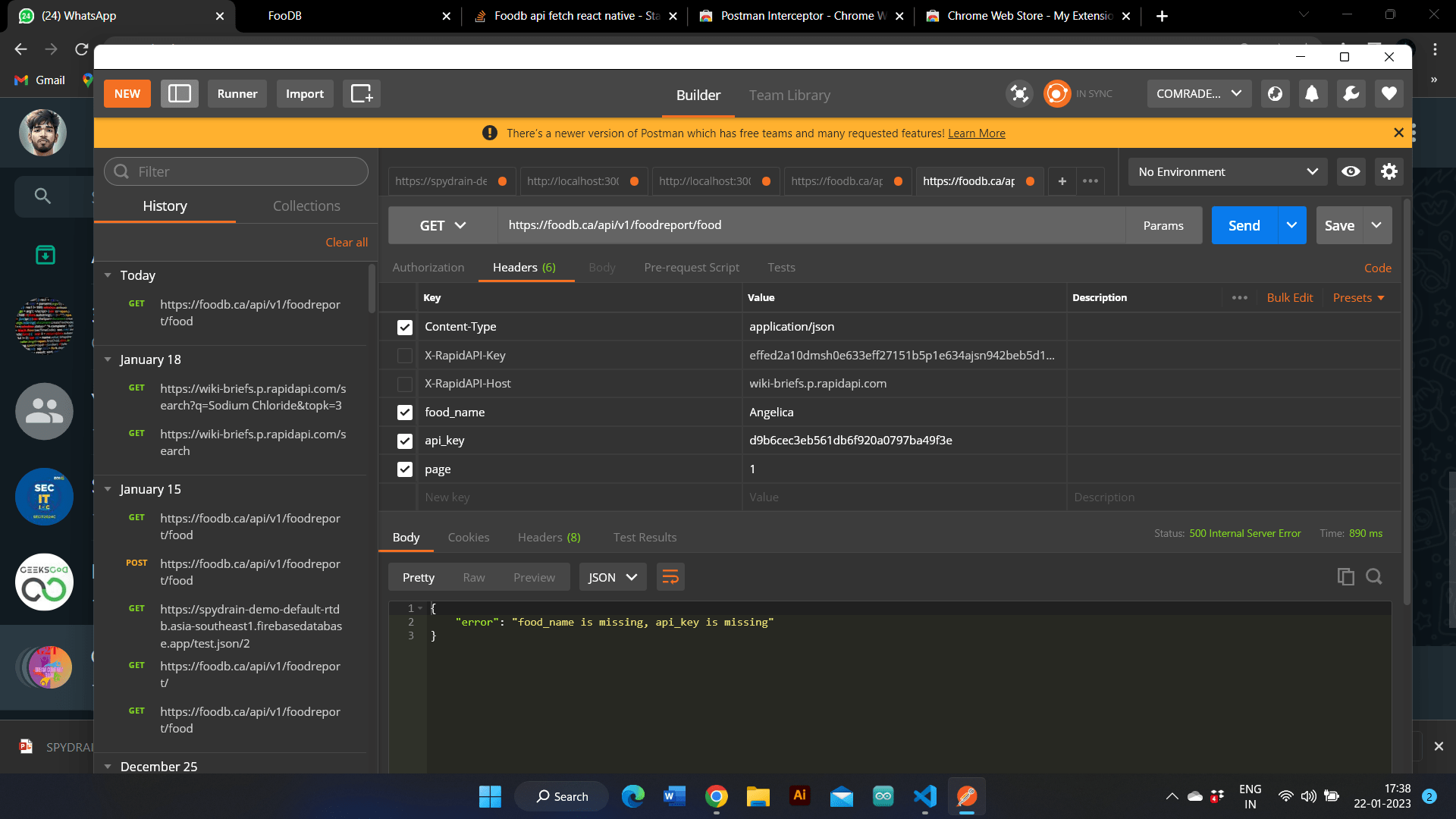 Hello I am a beginner in mobile app development. I am doing project in react native.In my app I need to fetch the food details from foodb website using API. I tried in postman to get response but I am getting error.