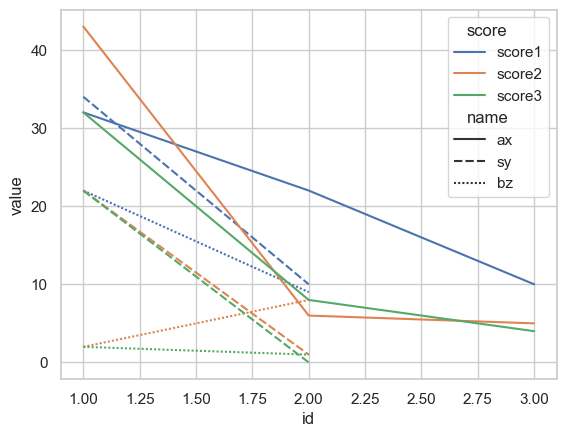 x='id', y='value', style='name', hue='score')