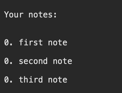 I’m writing a simple console note app, and having some issues with "foreach" function. When I enter "View", the notes should be displayed in order, but for each note I get "0", instead ‘0’ ‘1’ ‘2’.