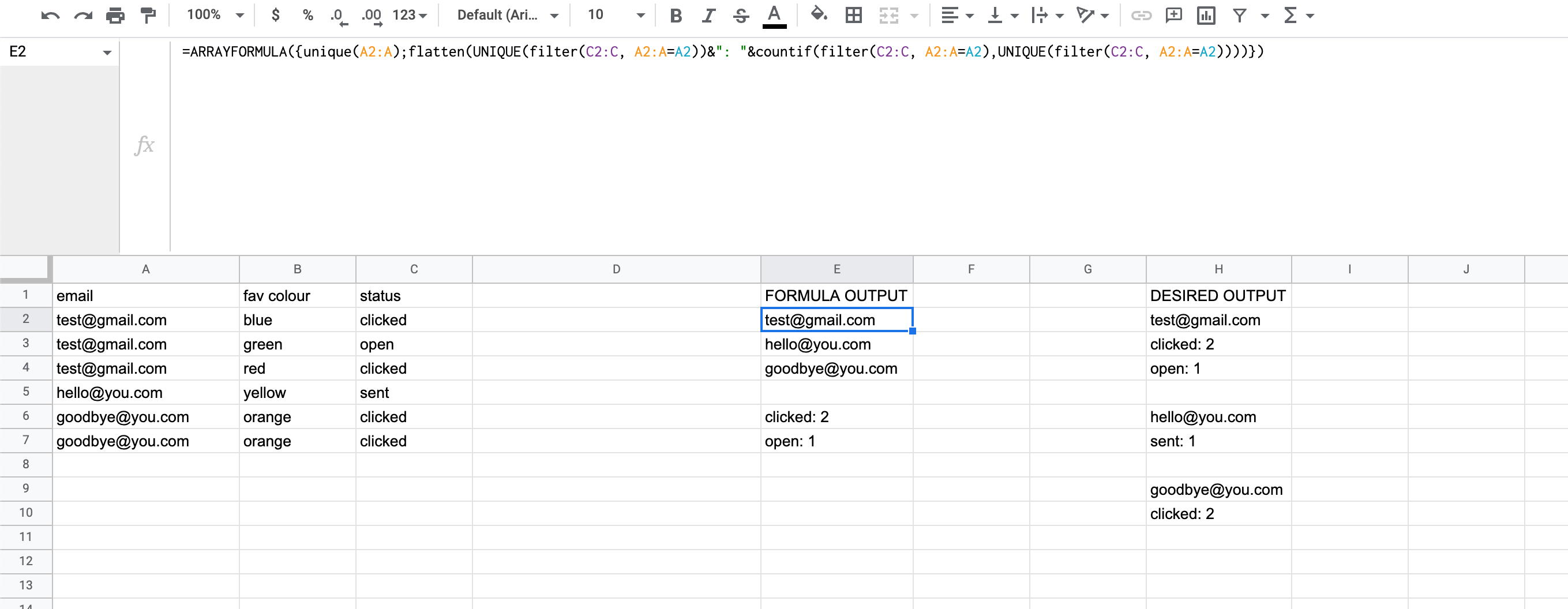 =ARRAYFORMULA({unique(A2:A);flatten(UNIQUE(filter(C2:C, A2:A=A2))&": "&countif(filter(C2:C, A2:A=A2),UNIQUE(filter(C2:C, A2:A=A2))))})