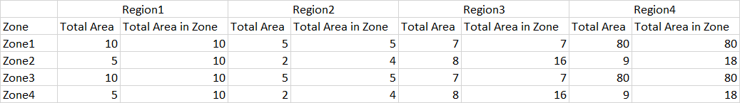 My full dataset has 58 total zones and 16 regions. I’m trying to figure out a solution that will work with N number of regions and N number of Zones so if the dimension of the dataframe changes we can still output a table showing the two area values for as many Zones and Regions in the dataset.