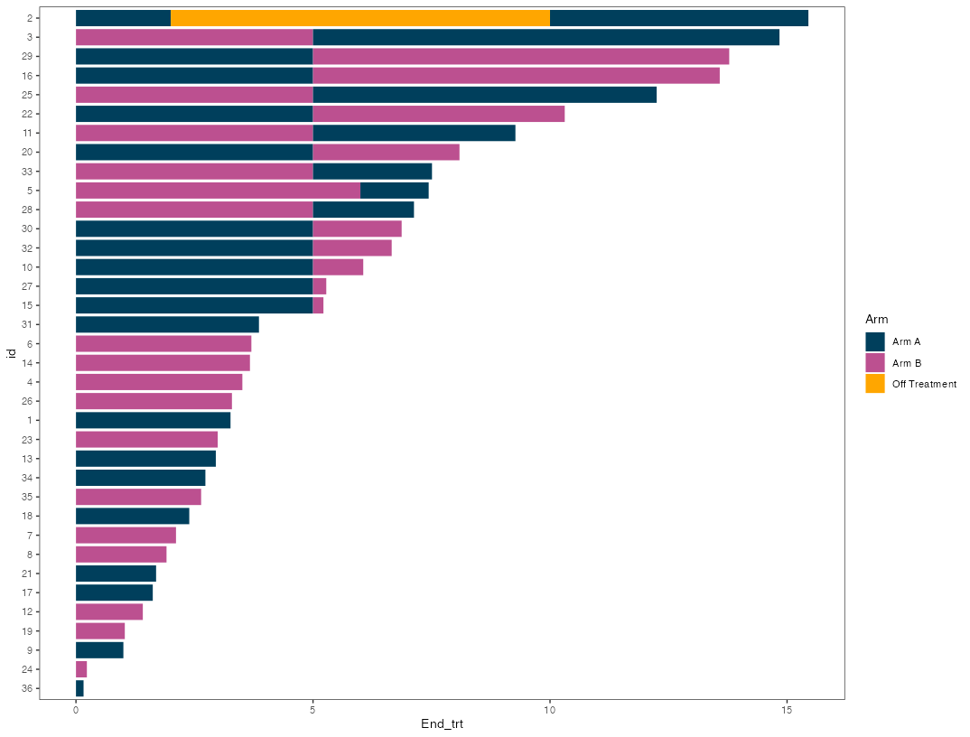 arm_plot <- swimmer_plot(df=ClinicalTrial.Arm,id='id',end='End_trt', name_fill = "Arm", width=.85) + scale_fill_manual(name="Arm",values = Colors) +