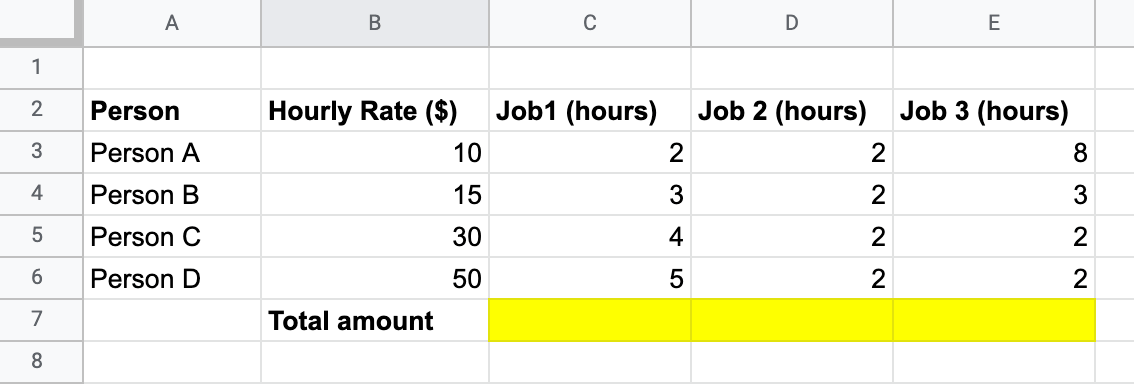 =SUMPRODUCT($B3:$B6,C3:C6)