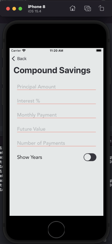 // Check if the necessary text fields are filled to find Monthly Payment if futureValueTextField.text != "" && principalAmountTextField.text != "" && numOfPaymentsTextField.text != "" && interestTextField.text != "" { print(2) monthlyPaymentTextField.text = String(calculateMonthlyPaymentCompound(principalAmount: P!, futureValue: A!, numOfPayments: PMT!, interestRate: r! / 100)) }