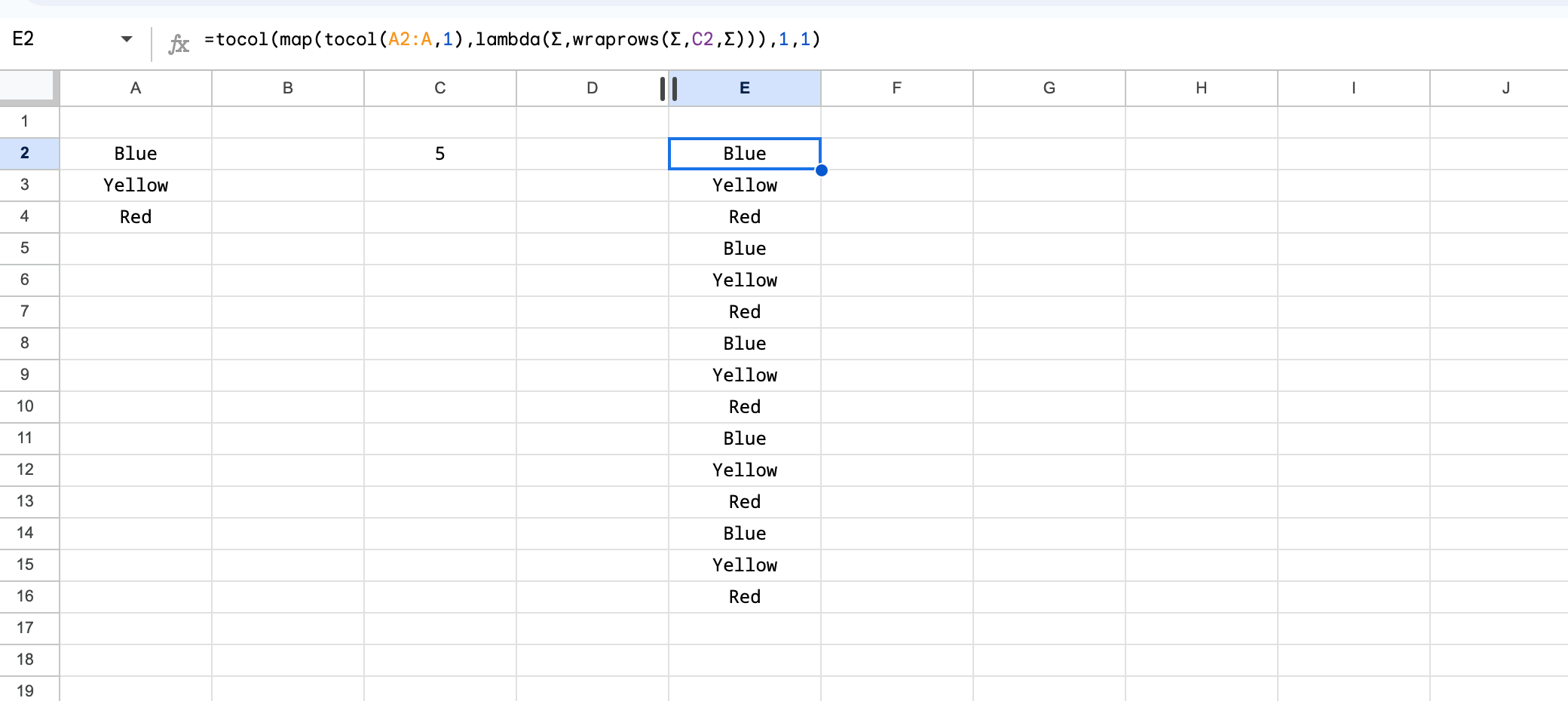 =tocol(map(tocol(A2:A,1),lambda(Σ,wraprows(Σ,C2,Σ))),1,1)