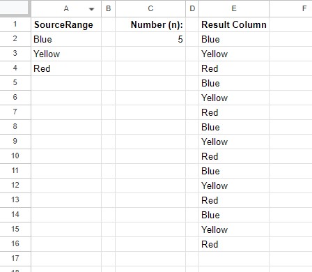 I’m trying to take a range of cells (SourceRange) and repeat it n times vertically in a column (Result Column). Here is an example of what I want to do: