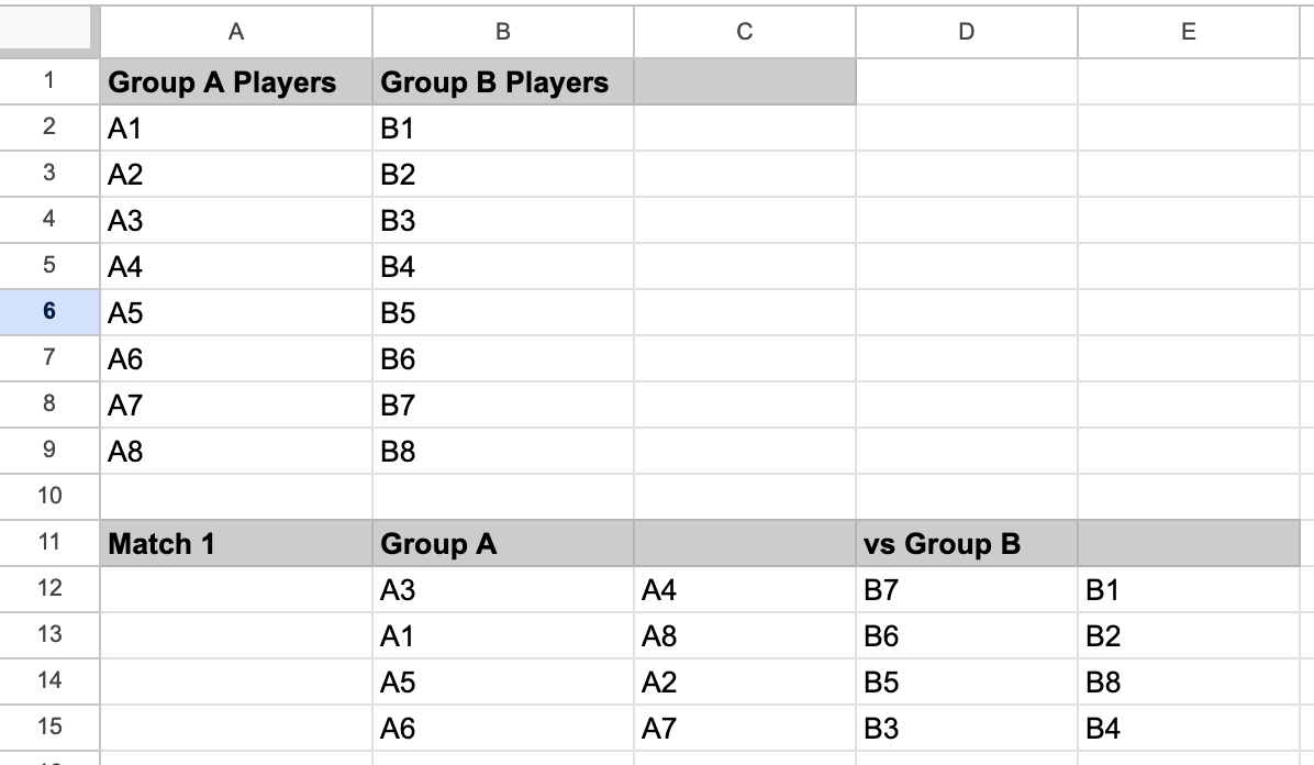 I need some help with the formulas for a google sheet I’m putting together. In the attached image you can see that I have two groups of players – with 8 players in each group.