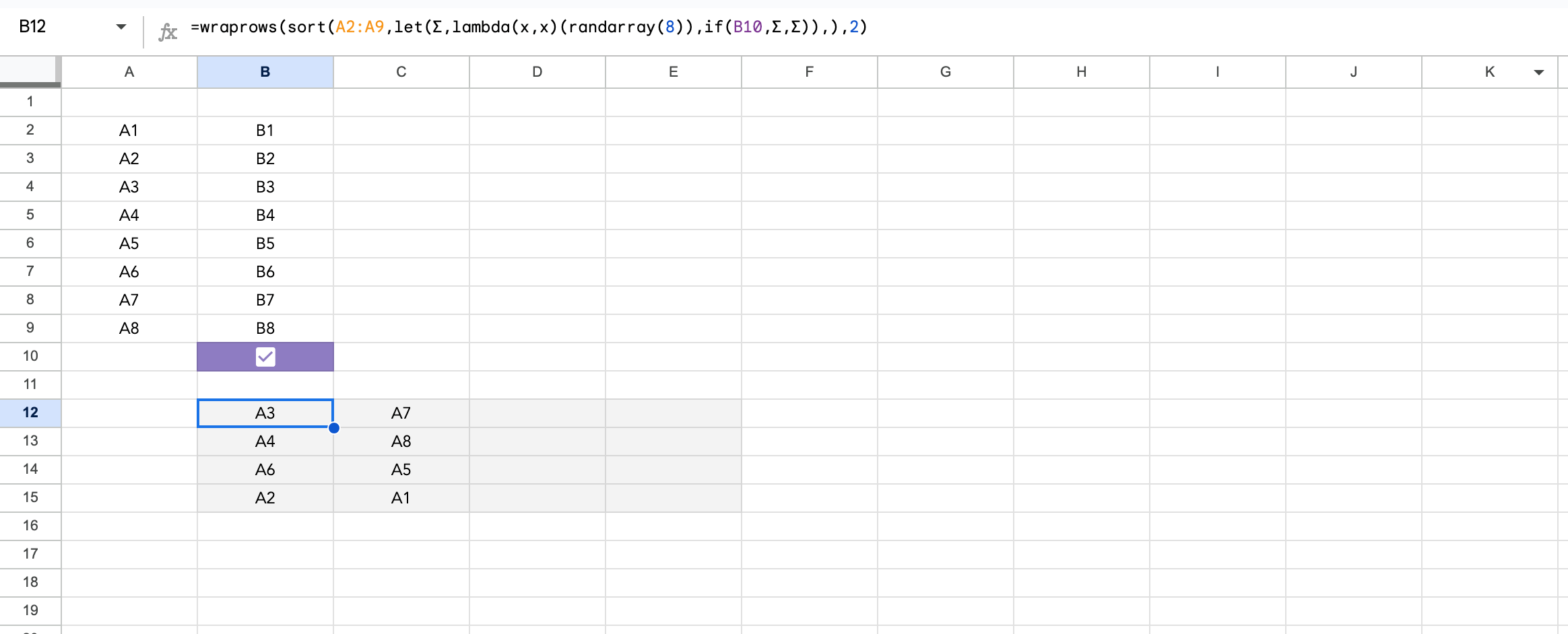 =wraprows(sort(A2:A9,let(Σ,lambda(x,x)(randarray(8)),if(B10,Σ,Σ)),),2)