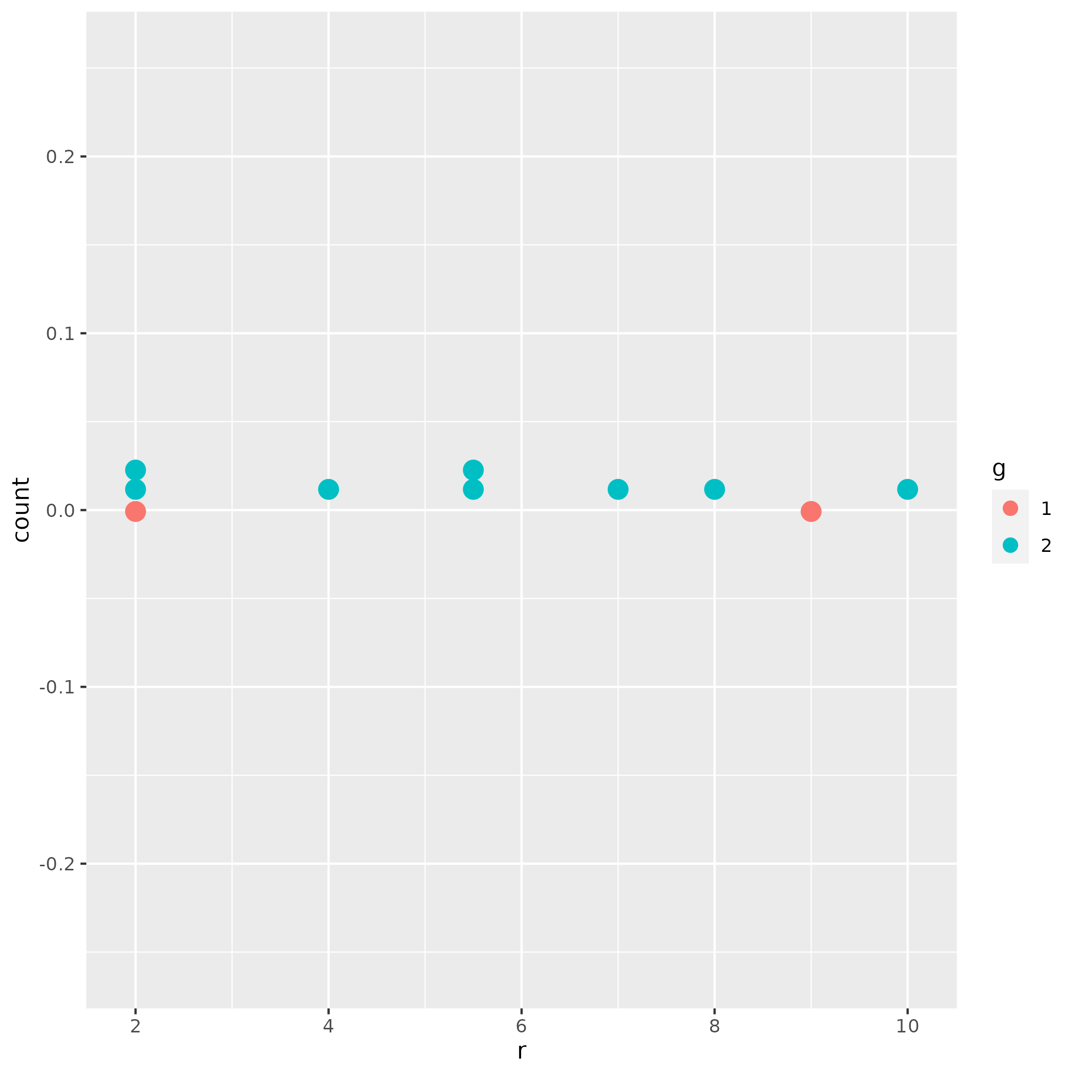 ggplot(dfc, aes(color=g, fill=g)) + geom_dotplot(position=ggstance::position_dodgev(height=0.025), aes(x=r), binwidth = 0.2)