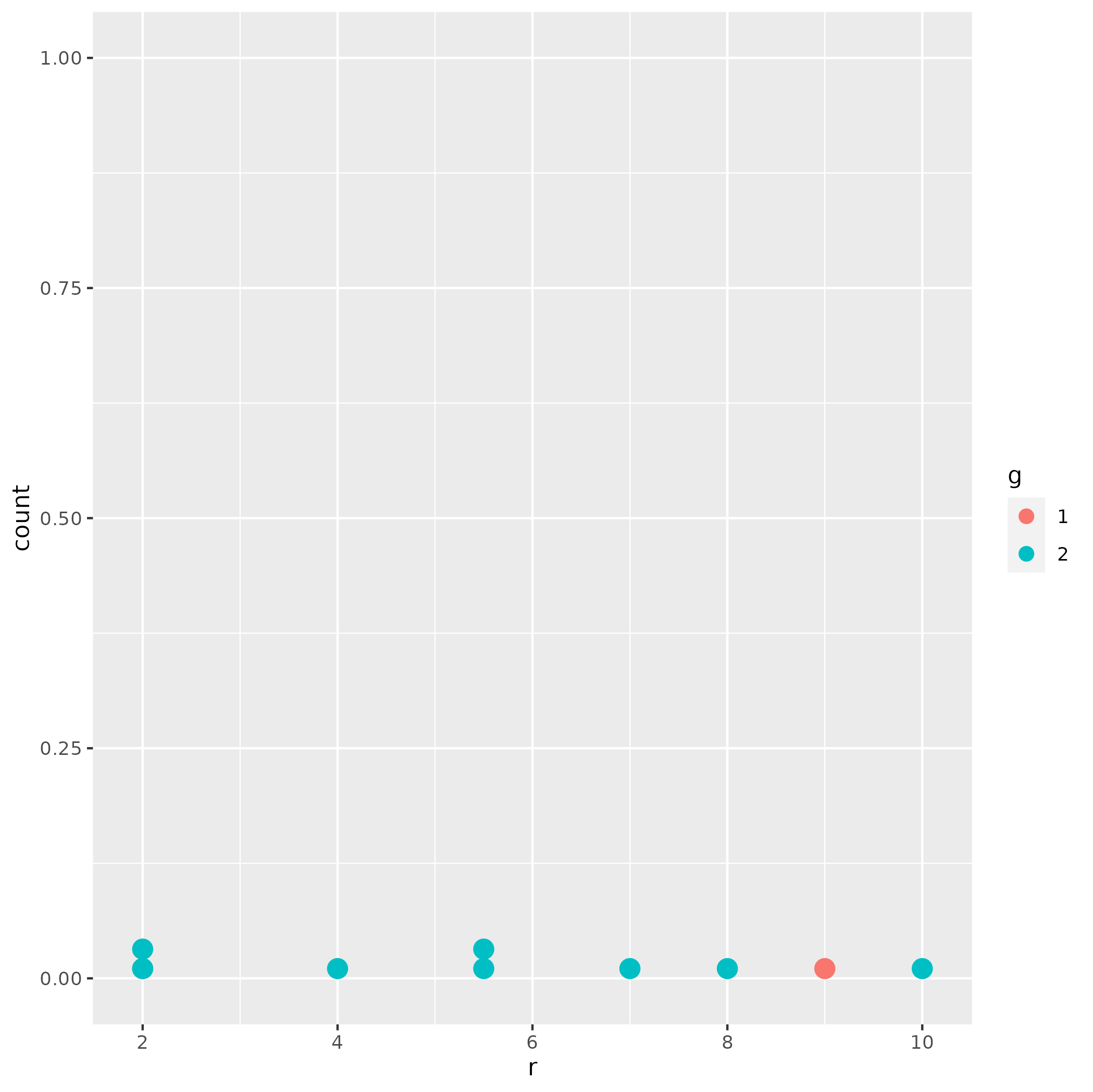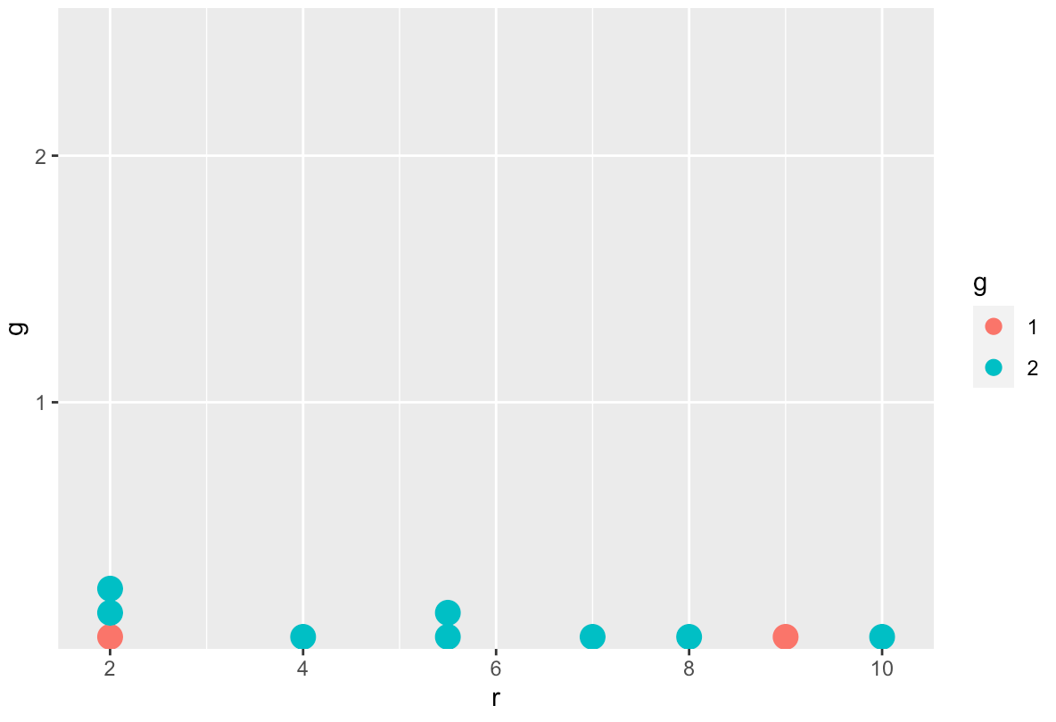 ggplot(dfc, aes(color=g, fill=g)) + geom_dotplot(aes(x=r, group = 1), binwidth = 0.2)