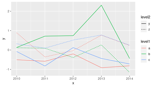 Here’s some data with x and y values, along with two grouping variables level1 and level2. I’d like to plot the grouping variables with colour and linetype aesthetics, like this: