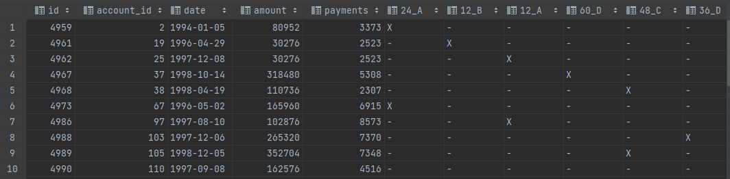 id,account_id,date,amount,payments,24_A,12_B,12_A,60_D,48_C,36_D,36_C,12_C,48_A,24_C,60_C,24_B,48_D,24_D,48_B,36_A,36_B,60_B,12_D,60_A