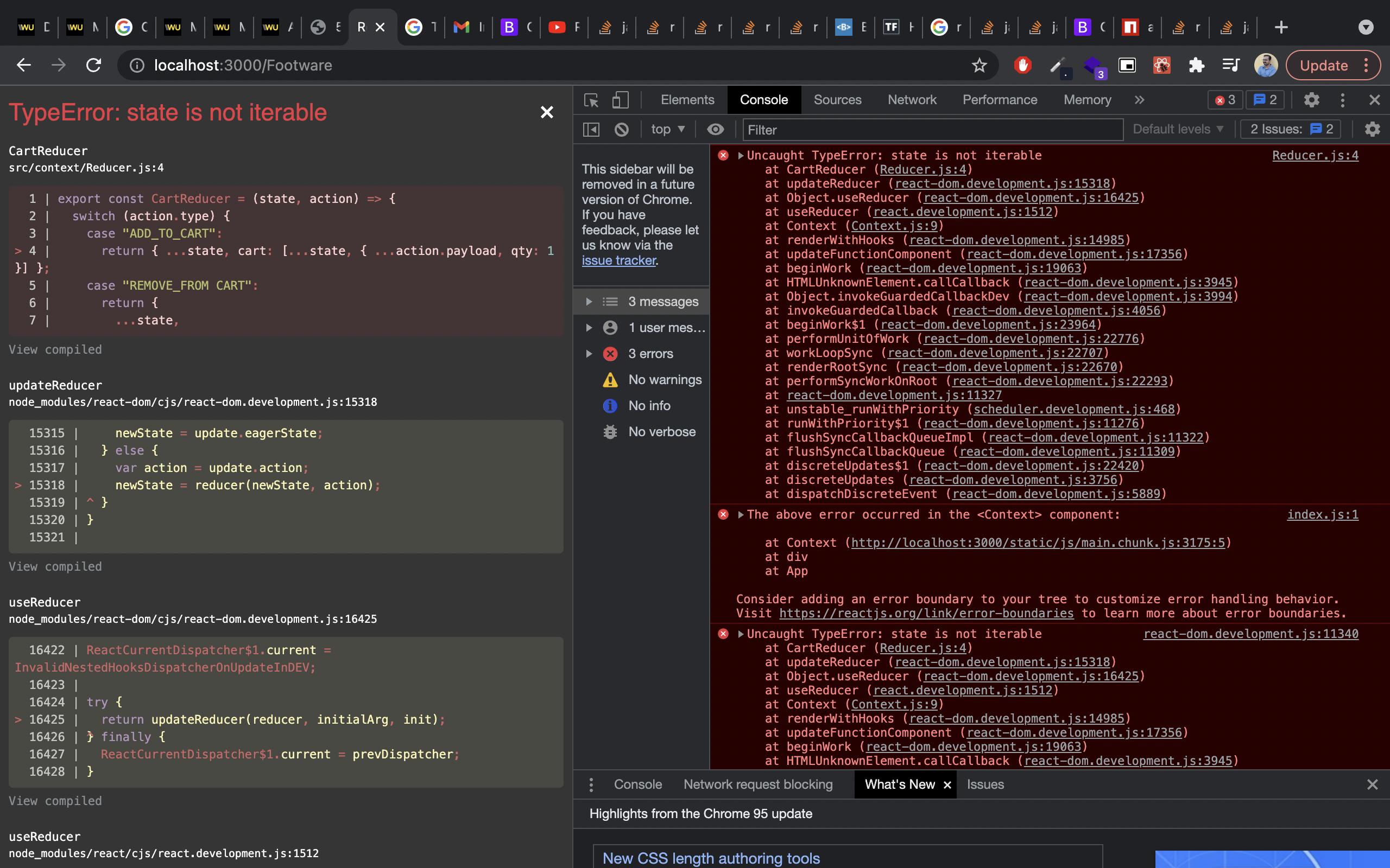 The ADD_TO_CART case needs to handle this by shallow copying state.cart array into the cart property: